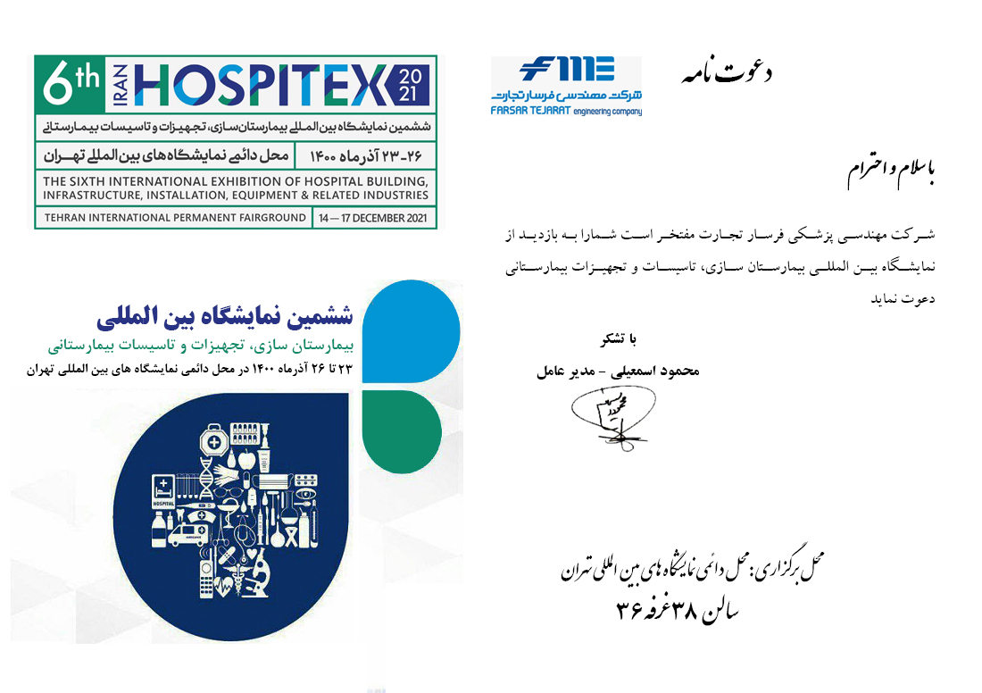شرکت مهندسی فرسار تجارت شما را به بازدید از نمایشگاه ایران هلث مورخ 3 الی 6 خرداد ماه در سالن 38 B غرفه 62 دعوت می نماید.